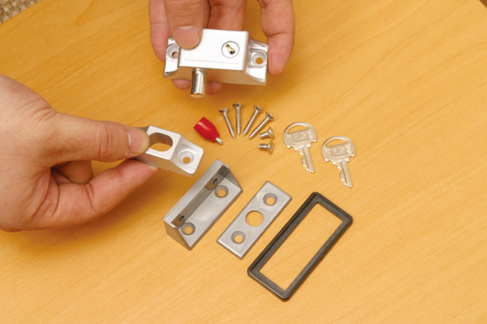 | 材質 | 本体:亜鉛ダイキャスト・真鍮 キー:真鍮 平受パーツ・L受パーツ:ABS樹脂 ストライク:亜鉛ダイキャスト ビス:ステンレス(ISO皿M4×8) ネジ:ステンレス(皿タッピングM3.5×20) ドリルネジ ネジ部:鉄(ナベM3.5×10) |